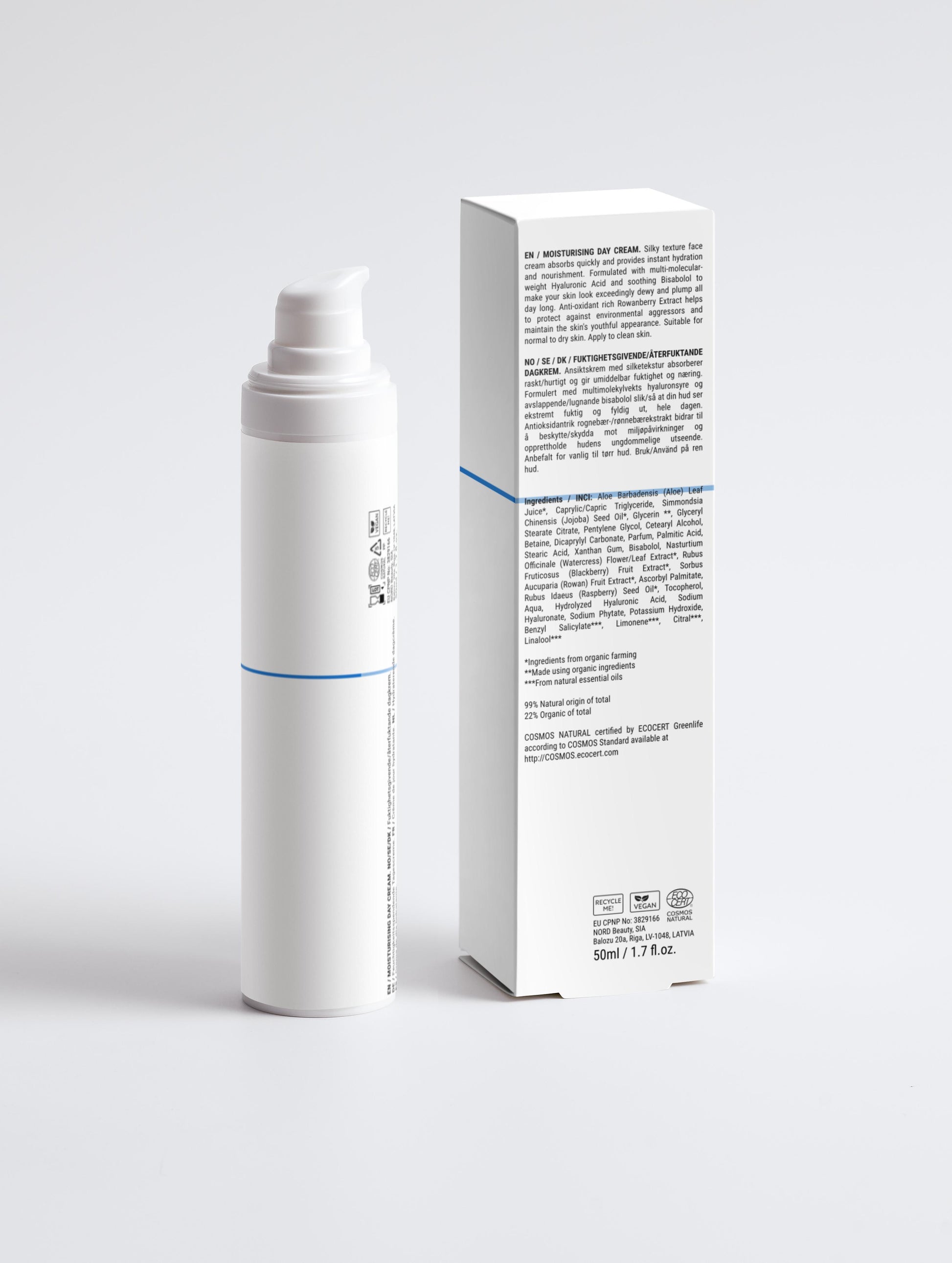De formule bevat multi-moleculair hyaluronzuur, dat zowel diep als oppervlakkig hydrateert, terwijl Bisabolol en botanische extracten zorgen voor comfort en een kalme huid. Rowanberry-extract, rijk aan antioxidanten, beschermt tegen dagelijkse invloeden van buitenaf en helpt een gezonde, jeugdige uitstraling te behouden.